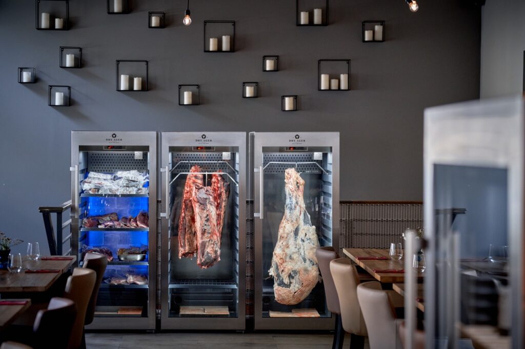 Jak už název napovídá, sem se chodí na steaky. Hovězí maso pochází výhradně z domácích chovů. Adam pečlivě vybírá jednotlivé kusy a staří je podle druhu masa 2 týdny až 3 měsíce přímo v restauraci, kde prosklené lednice ladí s jednoduchým dřevěným interiérem. V jedné zraje maso mokrou cestou, kdy se jednotlivé porce zavakuují a nechají se pozvolna vyzrávat ve vlastní šťávě 2–3 týdny. V dalších dvou lednicích jsou pověšené a položené větší kusy, které zrají suchou cestou. „Maso pomalu vysychá, voda se odpařuje a tuk se rovnoměrně rozkládá do svaloviny. Tzv. suché zrání trvá nejméně 1,5 měsíce,“ popisuje Adam Slezák. Délka záleží na druhu a velikosti masa.