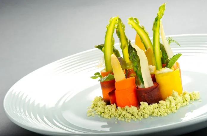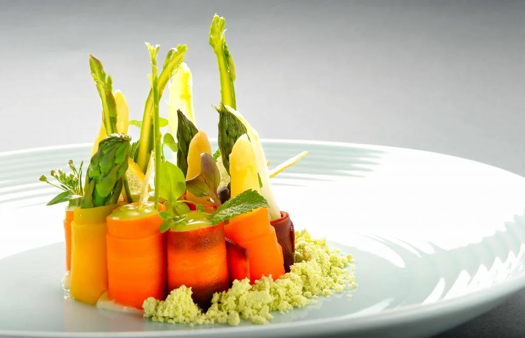 Z plátků karotky vymotáme přes prst ruličky a plníme je pomocí cukrářského pytlíku hmotou pyré, proléváme je střídavě dresinkem. Přidáme chřestové špičky a plátky, pokapeme limetovou šťávou, zdobíme sezónními bylinkami a mátovým prachem.