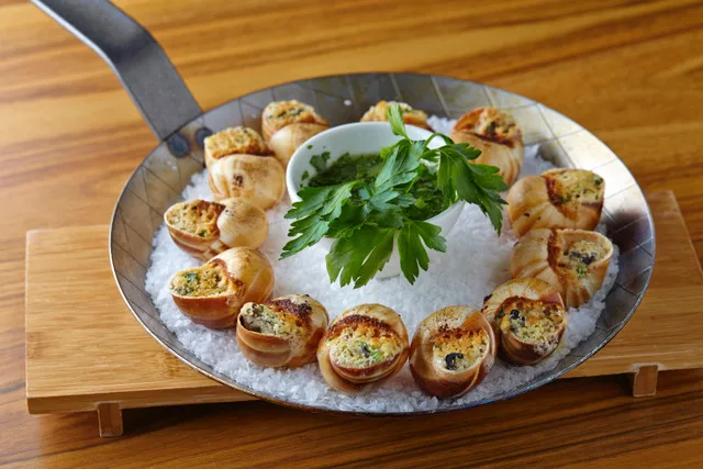 Šneky vložíme do směsi vína a vývaru, přidáme zeleninu a bouquet garni, osolíme, opepříme a dáme dusit. Připravíme si ulitky, pokud je potřeba je očistit, vaříme je 30 minut ve velkém množství vody, pak je necháme vystydnout a ještě důkladně očistíme od usedlin. Máslo necháme odpočinout, aby získalo pokojovou teplotu. Najemno nakrájíme listy petrželky, česnek a šalotky a smícháme vše se změklým máslem. Osolíme, opepříme a přimícháme strouhanku. Do každé ulity vložíme kousíček másla, pár kapek zredukovaného vývaru ze šneků a pak jemně vtlačíme plže. Ulity opět uzavřeme bylinkovým máslem, naskládáme je na pánev naplněnou hrubou solí a pečeme v troubě předehřáté na 180°C tak dlouho, než se máslo rozpustí a začne se barvit do hněda.