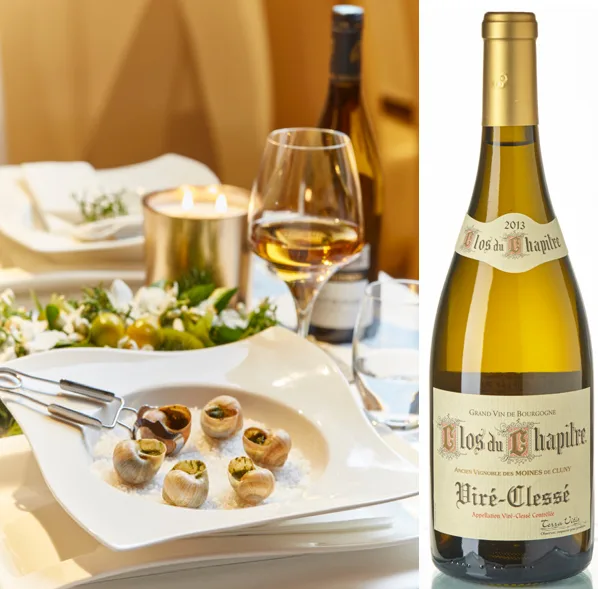 Jemná úprava šneků s bylinkami se krásně snoubí s minerální chutí Chablis. Víno pochází z odrůdy Chardonnay, která vyrůstá na půdě, kde bylo v pravěku moře a dodnes v ní lze nalézt lastury mořských živočichů. Díky tomu získává víno ze Chablis svoji nádhernou minerální a štíhlou chuť. Ovšem i toto Chardonnay pro změnu z jihu Burgundska zafunguje nádherně. AOC Viré-Clessé je jedním z nejmladších apelací v Maconnais a zdejší vína jsou bohatá s komplexem ovoce, bylin a květů, s nádhernou mineralitou typickou pro tuto oblast.