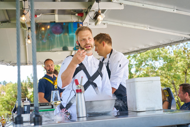 Následuje barevná, voňavá a překvapivá kulajda plná chutí, ozvláštněná špetkou libečku, pohankou a speciálně upraveným žloutkem. Hlavní chod představuje jemné telecí líčko s karamelizovaným jablkem a chipsy z topinamburu s lískovými oříšky. A k němu rakouský Grünner Veltliner Weissenkirchen Federspiel z Domäne Wachau ročníku 2023, který se sebevědomým ustojí i tenhle pokrm výraznější a bohatší chuti. Vegetariáni si pochutnají na ceviche z lilku a pečeném květáku se „spáleným“ jablkem a topinamburovými chipsy. Sladký závěr v podobě malinového crème brûlée s růžovým pepřem pak vystřelí do nebe nejenom ledovým dotykem máty, ale i tradiční „zakouřenou“ show.