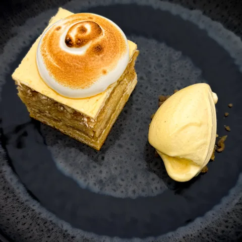 Pohankový košíček naplnil hříbkovým ragú. Hlavnímu chodu vévodí rump steak z Jižní Ameriky. Doplňuje jej karamelizovaná mrkev s divokou brokolicí, bramborové rösti, holandská omáčka a telecí demi-glace s hořčičným semínkem a uzeným špekem. V bezmasé variantě hraje hlavní roli bramborová galetta a vejce připravené metodou sous-vide na 63 °C. Tekutý žloutek fantasticky ladí s holandskou omáčkou a s pyré z pečeného lilku a sezamu. Na závěr pohladí chuťové pohárky jablečná žemlovka s flambovaným sněhem a zmrzlina ze zakysané smetany.