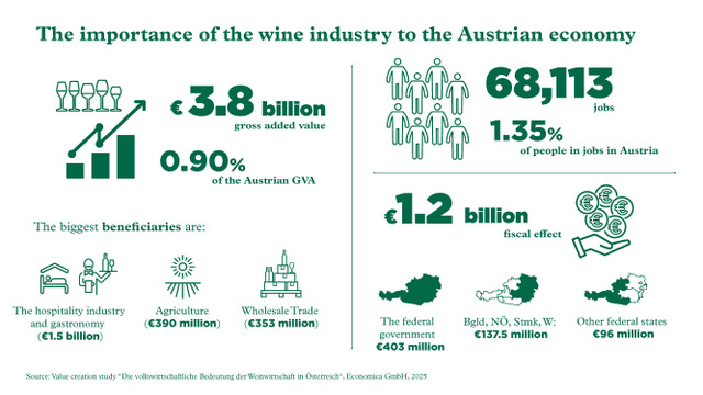 V roce 2023 tak rakouský vinařský průmysl vygeneroval hrubou přidanou hodnotu přes 3,8 miliardy eur, což představuje 0,9 procenta celkové ekonomické produkce Rakouska. Celkově se víno podílí 7,5 % na celkové zemědělské produkci a toto odvětví je přímo či nepřímo zodpovědné za více než 68 000 pracovních míst. To odpovídá zhruba polovině pracovních míst, která přímo zajišťuje kovoprůmysl (135 000). Z vinařského průmyslu významně těží i stát, do státní pokladny každoročně proudí přibližně 1,2 miliardy eur na daních a poplatcích. Přibližně 403 milionů eur, tj. 35 % této částky, jde spolkové vládě, zatímco dalších 137,5 milionů eur, tj. 12 %, jde čtyřem velkým vinařským spolkovým zemím – Dolnímu Rakousku, Burgenlandu, Vídni a Štýrsku – a dalších 96 milionů eur jde zbývajícím spolkovým zemím.