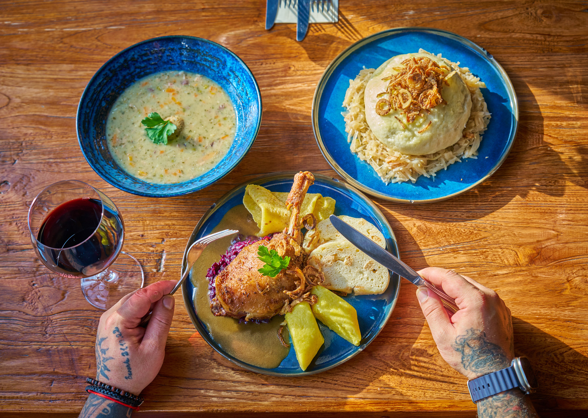 Menu začíná husím kaldounem s masovým knedlíčkem, pokračuje opečenými husími játry foie gras s karamelizovanými jablky a vrcholí konfitovaným husím stehnem s červeným zelím a variací knedlíků a lokšů.