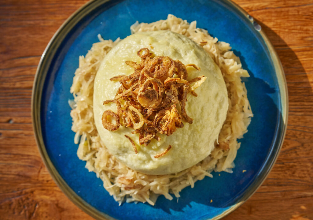 Nechybí ani husí paštika s cibulovým chutney a specialita podniku – kynutý blboun plněný trhanou husou a moravským zelím. Pro jedlíky je přes celý talíř, ale dá se objednat i v menší porci (skoro přes celý talíř)